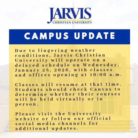 Hawkins, Texas — Due to lingering winter weather conditions impacting portions of the East Texas region, Jarvis Christian University (JCU) will operate on a delayed opening schedule on Wednesday, January 28, 2026. University offices will open, and classes will resume at 10:00 a.m. Students should check Canvas to determine whether their classes will be held in person or virtually. This delay is being implemented out of an abundance of caution to prioritize the safety and well-being of students, faculty, and staff.